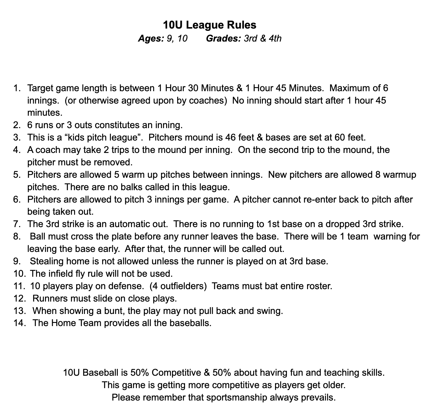 10U League Rules