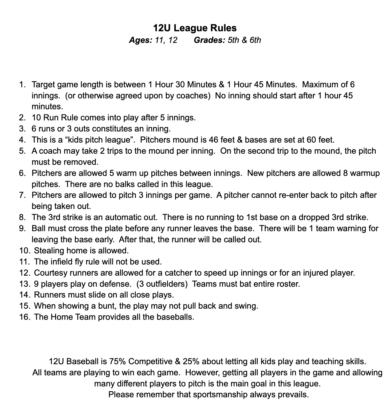 12U League Rules